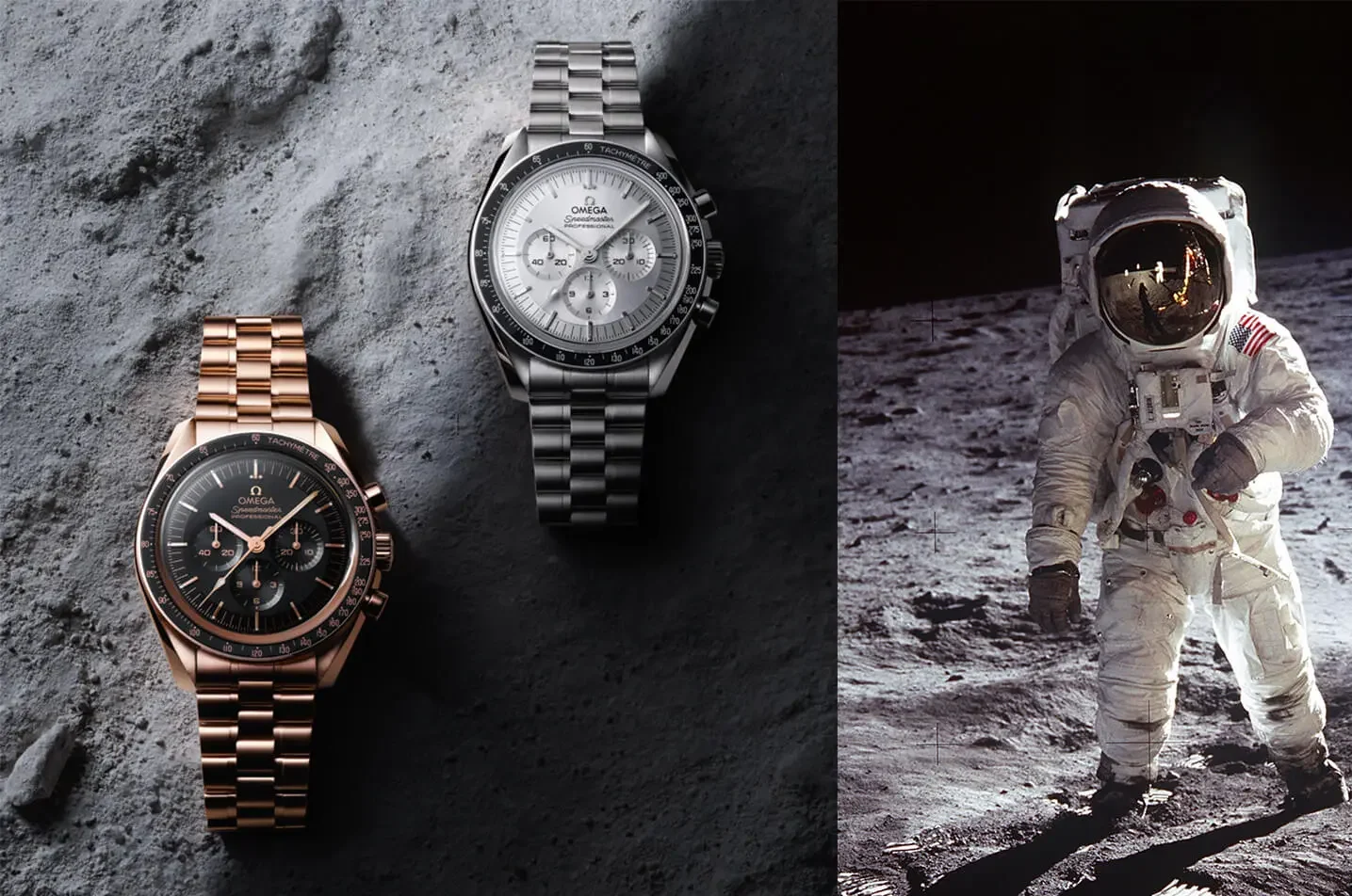 The distinctive OMEGA Speedmaster silhouette, recreated with authentic detail, crafted from innovative Moonshine Gold and Ceragold™ materials.